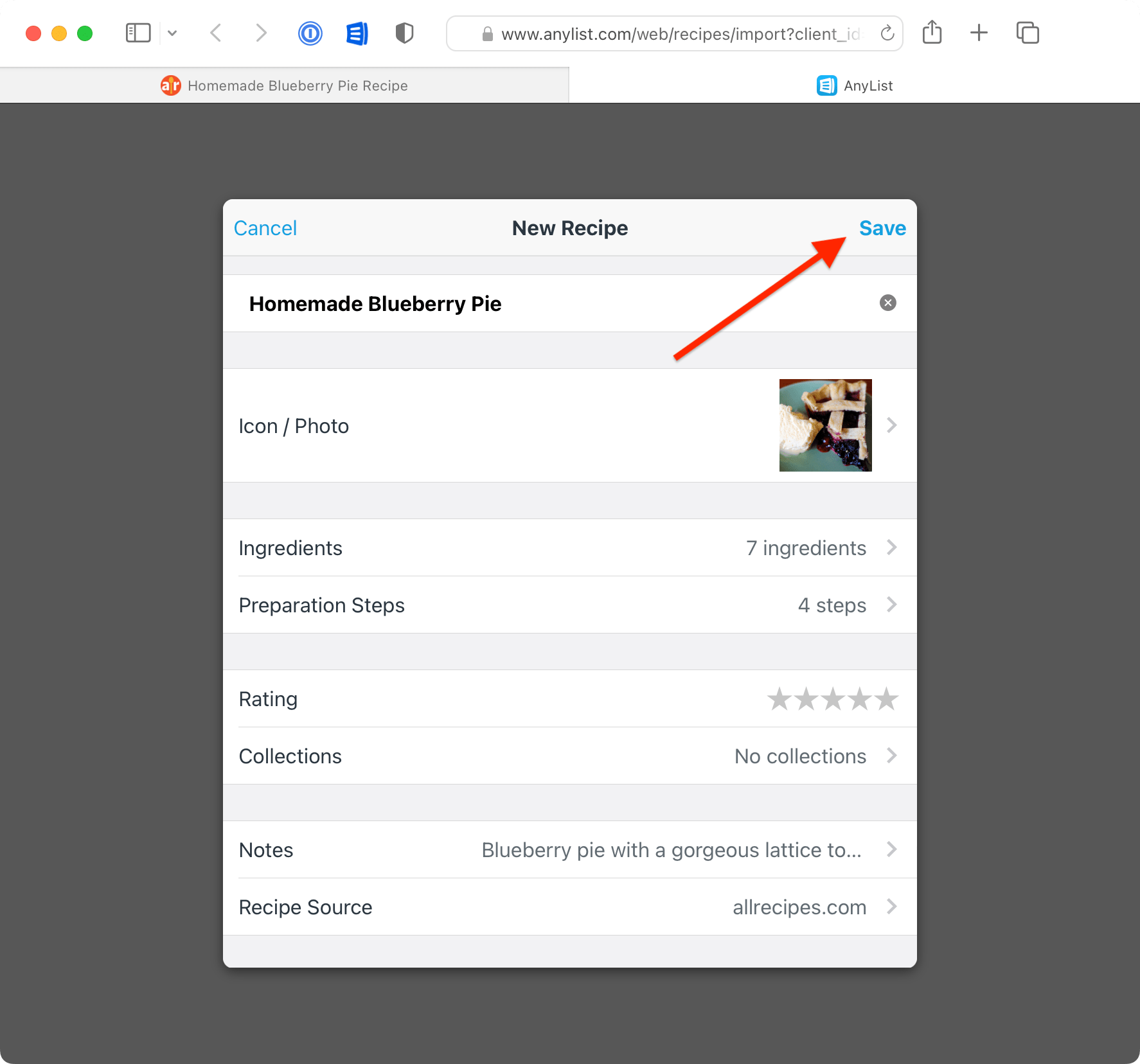A button will appear in the Safari toolbar. Click the AnyList button in the Safari toolbar while viewing a recipe web page to import the recipe.