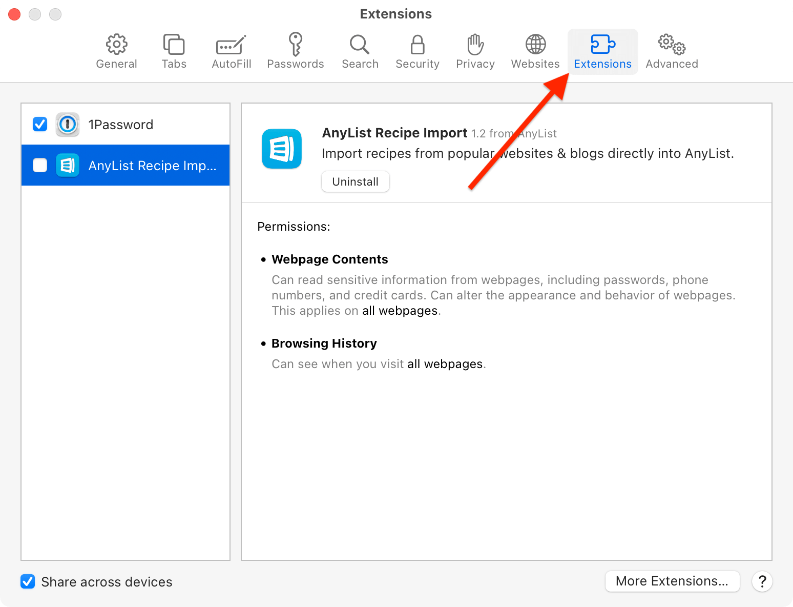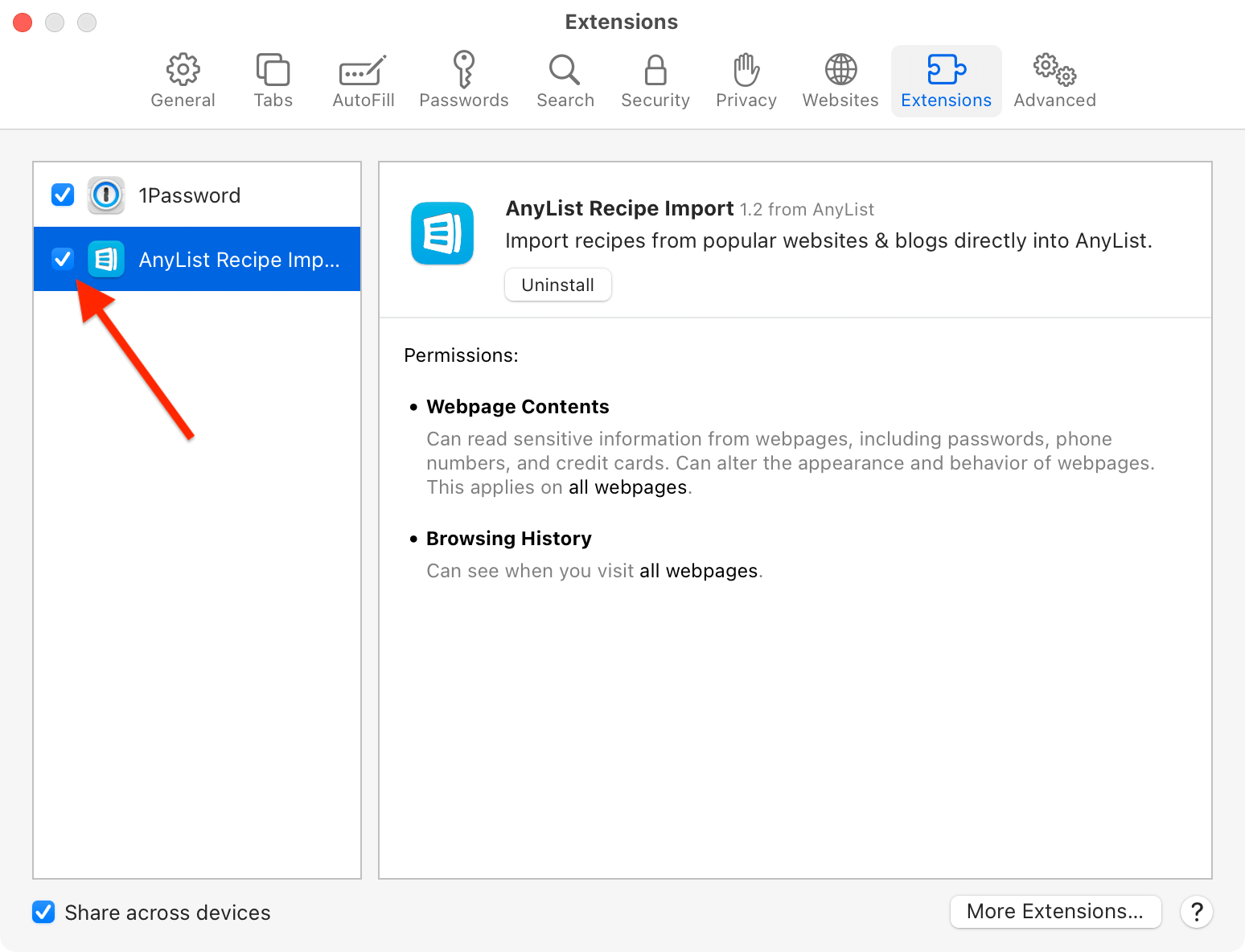 Check the box next to the AnyList Recipe Import extension. Then close the Safari settings.